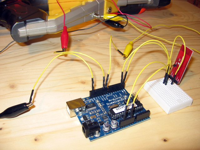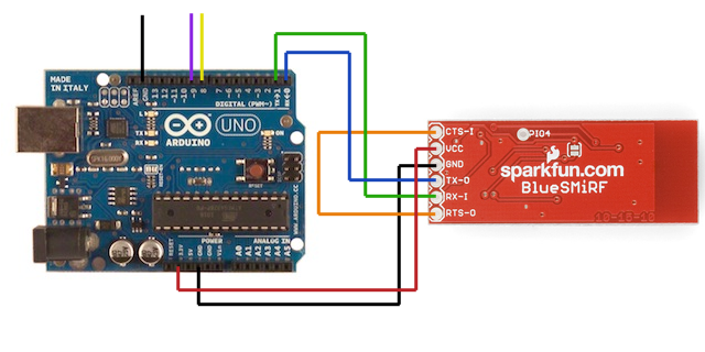 Hardware setup is pretty easy for this--it's nothing compared to what you've just done for the Nerf gun. Grab your breadboard, plug in your Bluetooth module (assuming you've soldered some headers onto the six-pin interface), and connect some wires according to the following diagram: