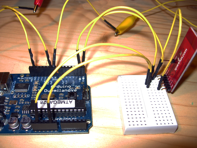 I started out with the sample programs included in the Arduino developers' section of the NeuroSky developer site. The first one to program the BlueSMiRF didn't seem to work at first, no matter whether I set it to 57,600bps or 115,200bps. It actually took me a couple of weeks to work through this problem, not least because I at one point accidentally reversed the Vcc and ground wires; half a second and a puff of smoke later, I was out one BlueSMiRF chip and $40. Lesson learned: never do that.